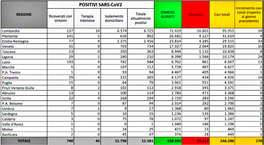 - Lombardia: 95.955 casi totali, +34 rispetto a ieri (6.725 attualmente positivi)