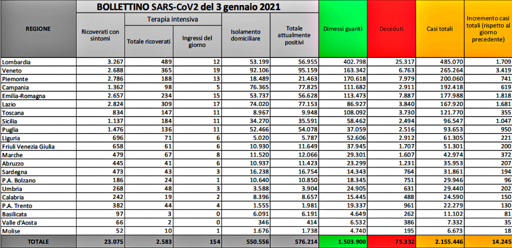 Nelle ultime 24 ore, in Italia si sono registrati 14.245 nuovi contagiati, 347 morti e 14.746 guariti. E’ quanto emerge dall’odierno bollettino del ministero della Salute sull’andamento epidemiologico del coronavirus in Italia. Ieri 364 persone erano decedute, i nuovi casi positivi registrati erano 11.831. Sono stati invece 102.974 i tamponi effettuati contro i 67.174 di ieri. Buona notizia sul cosiddetto “tasso di positività” registrato al 13,8%, contro il 17,6% di ieri.