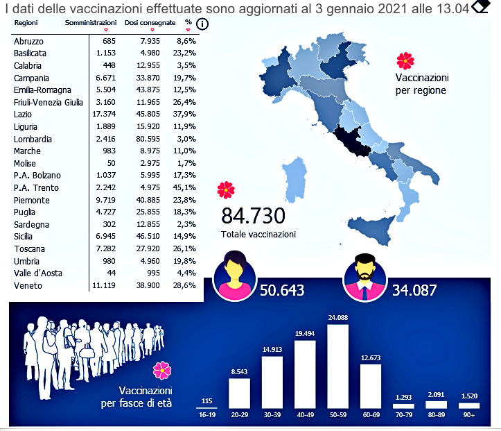 Delle 84.730 dosi di vaccino, 50.643 sono state somministrate a donne e 34.087 a uomini. La fascia d’età a cui sono state iniettate più dosi è quella 50-59 anni (24.088 vaccinazioni), seguita dalla fascia 40-49 (19.404) e da quella 30-39 (14.913). La stragrande maggioranza delle vaccinazioni riguarda operatori sanitari e socio-sanitari (75.327), a seguire personale non sanitario (4.190) e anziani ospiti delle Rsa (5.213). Mentre la provincia autonoma di Trento marcia a ritmo sostenuto (con il 45% delle dosi consegnate), il Lazio è la prima regione per vaccini somministrati in assoluto, oltre 17mila e 300 (quasi il 38%). A seguire Veneto, Friuli-Venezia-Giulia, Toscana e Piemonte, mentre sei regioni non arrivano al 10% delle fiale a loro disposizione: Abruzzo, Valle d’Aosta, Calabria, Lombardia, Sardegna e Molise.