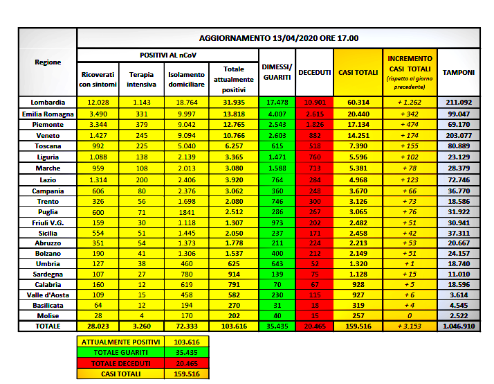 Il capo della Protezione civile, Angelo Borrelli, comunica gli ultimi dati sull’epidemia nel corso del punto stampa giornaliero. Sono complessivamente 103.616 i malati di coronavirus in Italia, con un incremento di 1.363 rispetto a ieri, quando l’incremento era stato di 1.984. Sono 20.465 le vittime dopo aver contratto il coronavirus in Italia, con un aumento rispetto a ieri di 566. Ieri l’aumento era stato di 431. Sono 35.435 le persone guarite in Italia dopo aver contratto il coronavirus, 1.224 più di ieri. Ieri l’aumento dei guariti era stato di 1.677. Il numero dei contagiati totali dal coronavirus in Italia – compresi morti e guariti – è di 159.516, con un incremento rispetto a ieri di 3.153. Calano ancora, per il decimo giorno consecutivo, i ricoveri in terapia intensiva. Sono 3.260 i pazienti nei reparti, 83 in meno rispetto a ieri. Di questi, 1.143 sono in Lombardia, 33 in meno rispetto a ieri. Dei 103.616 malati complessivi, 28.023 sono ricoverati con sintomi, 176 in più rispetto a ieri, e 72.333 sono quelli in isolamento domiciliare.
