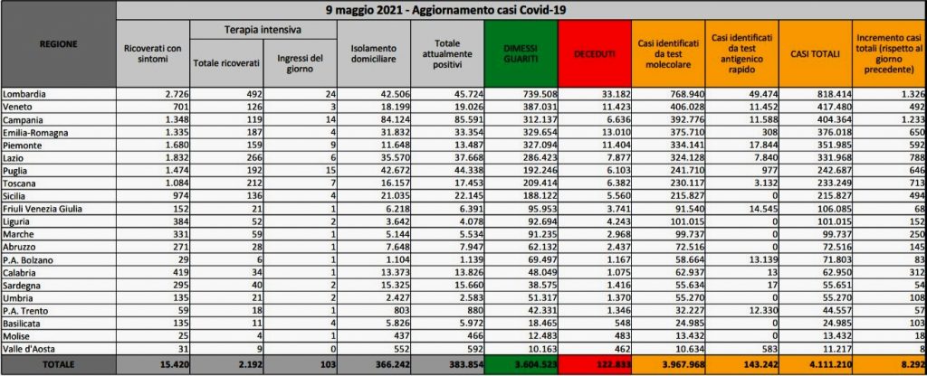 Da domani alcune regioni tornano a cambiare colore. Nessuna regione sarà in area rossa. Sono in area arancione le regioni Sicilia, Sardegna e Valle d’Aosta. Tutte le altre regioni e province autonome sono in area gialla. E, intanto, resta al centro del dibattito il green pass, il cosiddetto passaporto vaccinale che consentirà gli spostamenti non solo all’estero ma anche fra regioni di colore diverso. E si avvicina anche il giorno x per il coprifuoco: da metà maggio l’orario potrebbe essere esteso alle 24, a seconda dell’evoluzione della curva epidemica e del volume delle vaccinazioni. La linea è quella spiegata del premier Draghi: “Potrebbero esserci nuove aperture – ha avvertito il presidente del Consiglio -, ma dobbiamo essere graduali calcolando bene il rischio e usando la testa”.