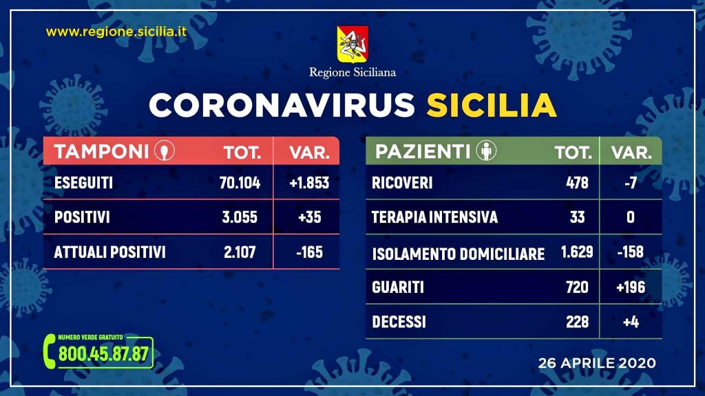 In Sicilia, boom di guariti e meno ricoveri e contagi. E’ quanto emerge dai dati diffusi dalla Regione Siciliana all’Unità di crisi nazionale. Questo il quadro riepilogativo della situazione nell’Isola, aggiornato alle ore 17 di oggi (domenica 26 aprile), in merito all’emergenza Coronavirus. Dall’inizio dei controlli, i tamponi effettuati sono stati 70.104 (+1.853 rispetto a ieri), su 65.689 persone: di queste sono risultate positive 3.055 (+35), mentre attualmente sono ancora contagiate 2.107 (-165), 720 sono guarite (+196, di cui 13 ricoverati e 183 in isolamento domiciliare) e 228 decedute (+4). Degli attuali 2.107 positivi, 478 pazienti (-7) sono ricoverati – di cui 33 in terapia intensiva (0) – mentre 1.629 (-158) sono in isolamento domiciliare.