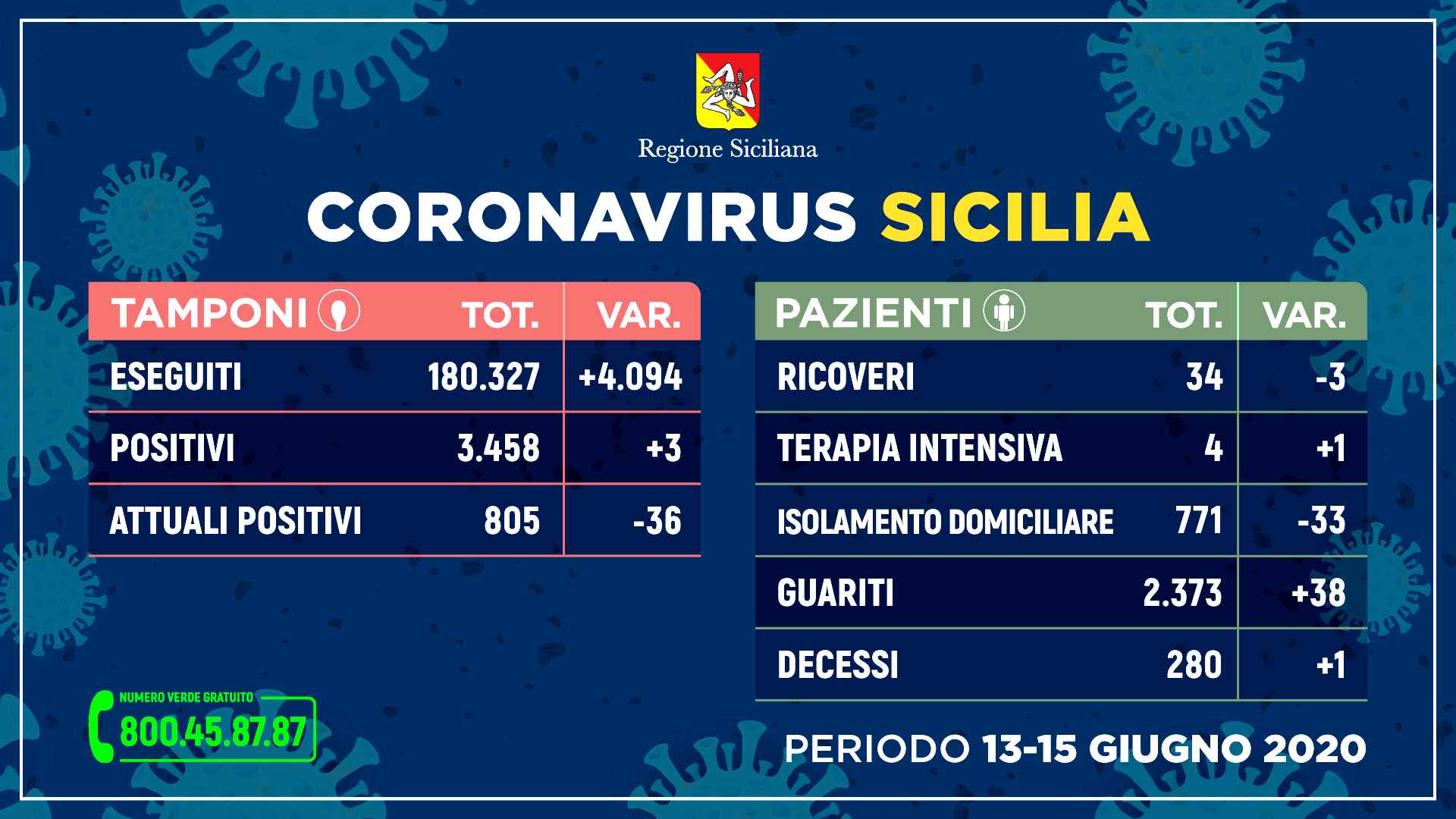 Questo il quadro riepilogativo della situazione nell’Isola, negli ultimi tre giorni (13-15 giugno) aggiornato alle ore 15 di oggi, in merito all’emergenza Coronavirus, così come comunicato dalla Regione Siciliana all’Unità di crisi nazionale. Dall’inizio dei controlli, i tamponi effettuati sono stati 180.327 (+4.094 rispetto a venerdì 12 giugno), su 150.982 persone: di queste sono risultate positive 3.458 (+3), mentre attualmente sono ancora contagiate 805 (-36), 2.373 sono guarite (+38) e 280 decedute (+1). Degli attuali 805 positivi, 34 pazienti (-3) sono ricoverati – di cui 4 in terapia intensiva (+1) – mentre 771 (-33) sono in isolamento domiciliare.