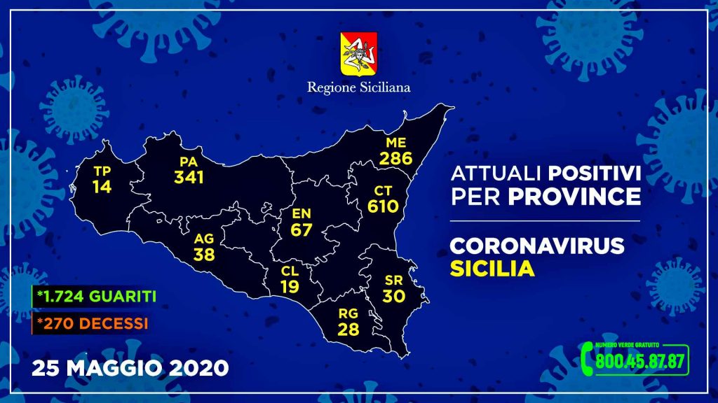 Questa la divisione degli attuali positivi nelle varie province: Agrigento, 38 (0 ricoverati, 102 guariti e 1 deceduto); Caltanissetta, 19 (4, 142, 11); Catania, 610 (30, 362, 98); Enna, 67 (5, 325, 29); Messina, 286 (30, 221, 56); Palermo, 341 (26, 201, 34); Ragusa, 28 (0, 62, 7); Siracusa, 30 (3, 189, 29); Trapani, 14 (0, 120, 5).