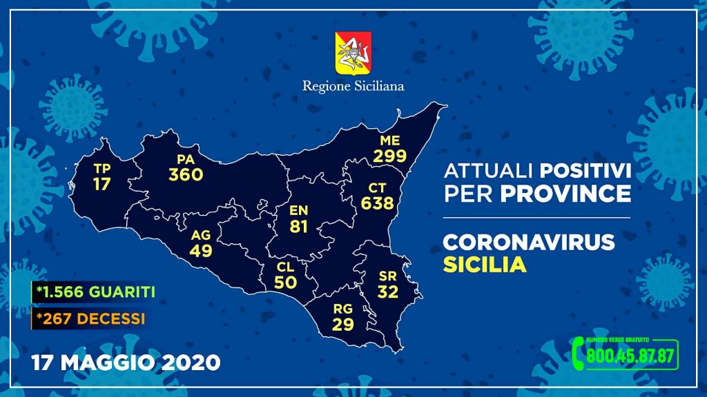 Questo il quadro riepilogativo della situazione nell’Isola, aggiornato alle ore 15 di oggi, in merito all’emergenza Coronavirus, così come comunicato dalla Regione Siciliana all’Unità di crisi nazionale. Dall’inizio dei controlli, i tamponi effettuati sono stati 117.426 (+2.463 rispetto a ieri), su 105.074 persone: di queste sono risultate positive 3.388 (+6), mentre attualmente sono ancora contagiate 1.555 (-104), 1.566 sono guarite (+108) e 267 decedute (+2). Degli attuali 1.555 positivi, 158 pazienti (-13) sono ricoverati – di cui 13 in terapia intensiva (+1) – mentre 1.397 (-91) sono in isolamento domiciliare.