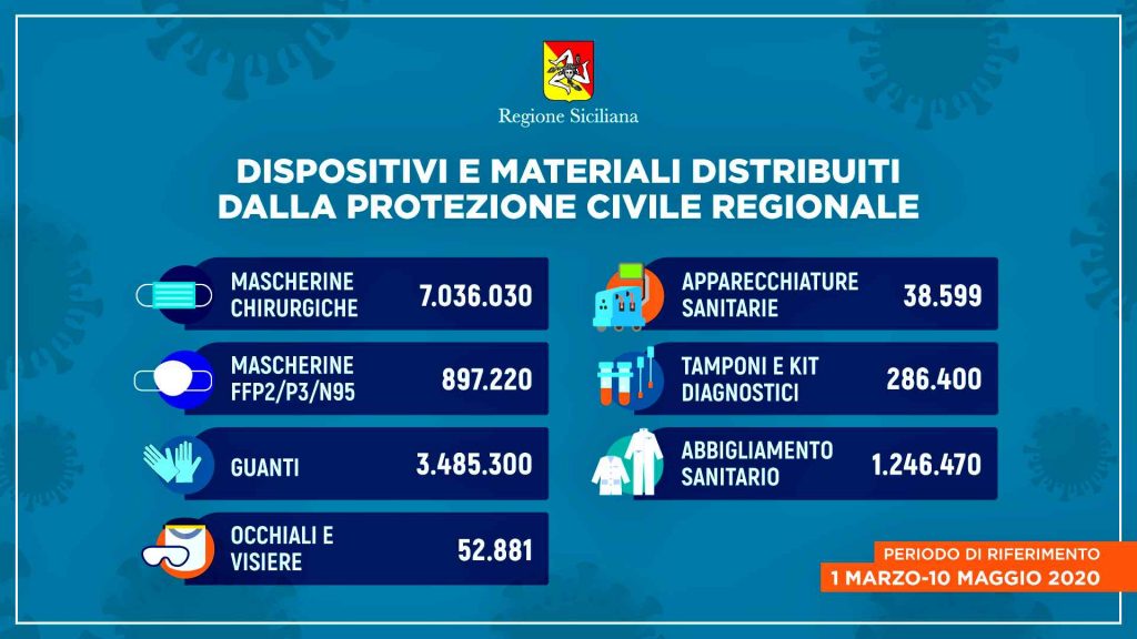 La Regione Siciliana comunica inoltre che ha distribuito oltre tredici milioni di dispositivi di protezione individuale e apparecchi sanitari – dall’inizio dell’epidemia fino a ieri – tramite la propria Protezione civile. A beneficiarne, principalmente: strutture sanitarie, case di riposo per anziani, residenze sanitarie assistite, Comuni, Prefetture, Forze dell’Ordine, Esercito, ex Province, carceri, dipartimenti regionali, Confcommercio e Confesercenti.