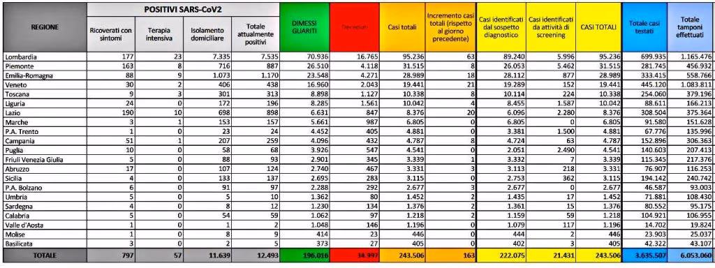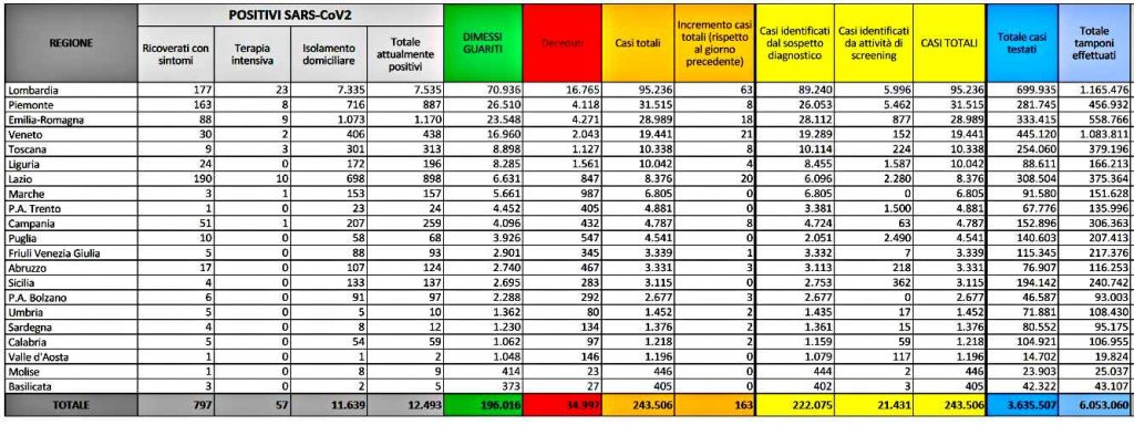 I guariti sono 198.016, in aumento di 575 rispetto a ieri. Continuano a diminuire i pazienti Covid in terapia intensiva in Italia, da 60 a 57 in 24 ore. In calo anche in Lombardia, da 27 a 23 (-4). In aumento anche oggi come ieri però i ricoverati con sintomi, +20 per un totale di 797 (martedì erano saliti di 9 unità). In isolamento domiciliare ci sono 11.639 persone, in calo di 443 unità. I tamponi aumentano ancora rispetto al giorno prima, ne sono stati effettuati 48.449.
