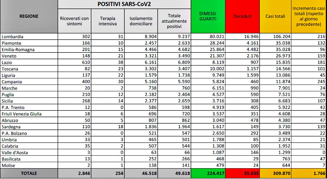 Sono in totale 35.038 i positivi al coronavirus in Piemonte, +132 rispetto a ieri. I casi importati sono 8 su 132. I contagi sono così suddivisi su base provinciale: 4354 Alessandria, 1968 Asti, 1124 Biella, 3416 Cuneo, 3280 Novara, 17.509 Torino, 1663 Vercelli, 1212 Verbano-Cusio-Ossola, oltre a 296 residenti fuori regione, ma in carico alle strutture sanitarie piemontesi. I restanti 216 casi sono in fase di elaborazione e attribuzione territoriale. I ricoverati in terapia intensiva sono 10 (+0 rispetto a ieri). I ricoverati non in terapia intensiva sono 166(+2 rispetto a ieri). Le persone in isolamento domiciliare sono 2457. I tamponi diagnostici finora processati sono 704.623 di cui 391.695 risultati negativi. Oggi l`Unità di Crisi della Regione Piemonte ha comunicato che i pazienti virologicamente guariti, cioè risultati negativi ai due test di verifica al termine della malattia, sono 27.876(+83 rispetto a ieri), così suddivisi su base provinciale: 3441 (+6) Alessandria, 1633 (+3) Asti, 876 (+2) Biella, 2708 (+5) Cuneo, 2544 (+19) Novara, 14.166 (+38) Torino, 1299 (+19) Vercelli, 1019 (+1) Verbano-Cusio-Ossola, oltre a 190 (+0) provenienti da altre regioni. Altri 368 sono “in via di guarigione”, ossia negativi al primo tampone di verifica, dopo la malattia e in attesa dell`esito del secondo. Un decesso di persona positiva al test del Covid-19 è stato comunicato nel pomeriggio dall`Unità di Crisi della Regione, nessuno verificatosi oggi (si ricorda che il dato di aggiornamento cumulativo comunicato giornalmente comprende anche decessi avvenuti nei giorni precedenti e solo successivamente accertati come decessi Covid).Il totale sale quindi 4.161 deceduti risultati positivi al virus, così suddivisi per provincia: 681 Alessandria, 256 Asti, 209 Biella, 401Cuneo, 377 Novara, 1839 Torino, 225 Vercelli, 133 Verbano-Cusio-Ossola, oltre a 40 residenti fuori regione, ma deceduti in Piemonte.