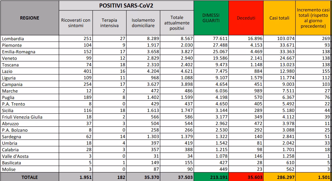 Sono 1.501 (ieri, 1616) i nuovi casi di coronavirus registrati oggi in Italia per un totale di 286.297 casi, mentre i nuovi decessi sono in totale 6 rispetto i 10 della giornata di ieri . E’ quanto emerge dall’odierno bollettino del ministero della Salute sull’emergenza Covid-19. Balzo dei ricoveri in regime ordinario, 102 in più, per un totale di 1.951, mentre è più contenuto l’aumento delle terapie intensive, +7 arrivando a 182. I ricoverati con sintomi sono ora 1.951 (+1.002 rispetto a ieri), in isolamento domiciliare si trovano 35.370 persone (+627). Gli attualmente positivi aumentano di 736 e sono ora 37.503. Per quanto riguarda, invece, i guariti sono stati 759 rispetto alla giornata di ieri mentre sono stati effettuati 92.706 tamponi, meno rispetto agli 98.880 del giorno precedente.