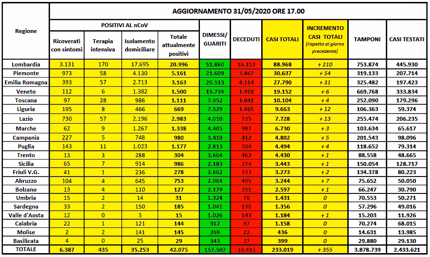 Mentre 6.387 persone sono ricoverate con sintomi, con un decremento di 293 pazienti rispetto a ieri. Rispetto a ieri i deceduti per coronavirus sono 75 e portano il totale a 33.415. Inoltre, il numero complessivo dei dimessi e guariti sale invece a 157.507, con un incremento di 1.874 persone rispetto a ieri. Per quanto riguarda il numero di individui controllati, oggi sono stati testati 28948 casi (contro i 54.118 tamponi effettuati). Si tratta di un positivo ogni 82 persone, ovvero 1,2%. Per quanto riguarda il numero di tamponi, oggi sono stati fatti 54118 test (ieri 69342). Il rapporto tra tamponi fatti e casi individuati è di 1 malato ogni 152,4 tamponi fatti, il 0,7%. Negli ultimi giorni questo valore è stato in media del 0,7%.