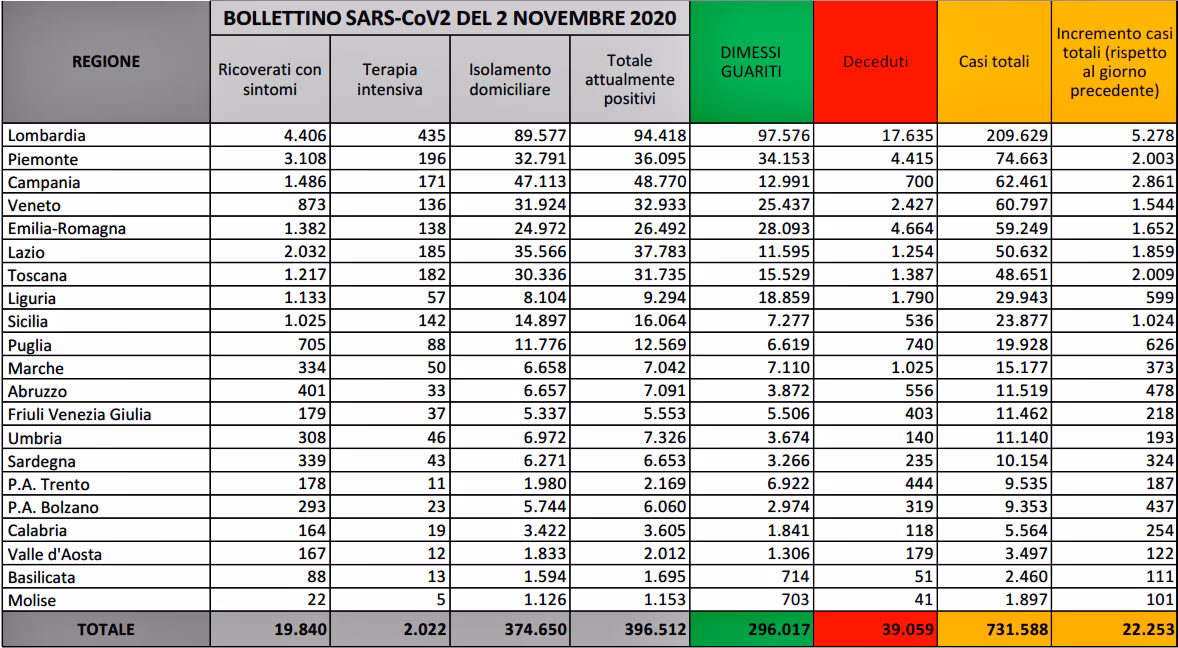 Tra le regioni con il maggior numeri di nuovi contagiati individuati domina sempre la Lombardia con 5.278 (ieri 8.607), poi Campania 2.861 (ieri 3.860), Toscana 2.009 (ieri 2.379), Piemonte 2.003 (ieri 2.024), Lazio 1.859 (ieri 2.351), Emilia Romagna 1.652 (ieri 1.758), Veneto 1.544 (ieri 2.300). Gli aumenti minori si registrano in Molise (+101), Basilicata (+111) e Valle d’Aosta (122).