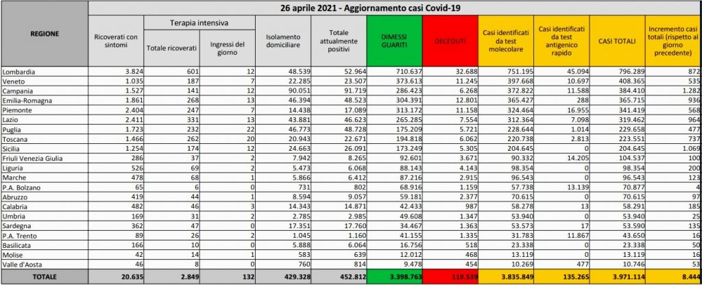 Il totale delle vittime da inizio pandemia è salito a 119.539. Lieve calo della pressione sulle strutture ospedaliere: i ricoveri ordinari sono 20.635, con un decremento di 27 unità rispetto a ieri, i pazienti in terapia intensiva 2.849, 13 in meno rispetto a ieri (con 132 ingressi del giorno, a fronte dei 114 di ieri). Sono invece già guariti dal Covid 3.398.763 di pazienti (+16.539). Gli attualmente positivi sono dunque 452.812 (8.400 in meno). La Regione in cui si registrano più casi su base giornaliera è la Campania. Le dosi di vaccino somministrate in Italia sono in totale 17.751.562 mentre sono 5.215.459 le persone che hanno effettuato anche il richiamo completando il ciclo vaccinale.