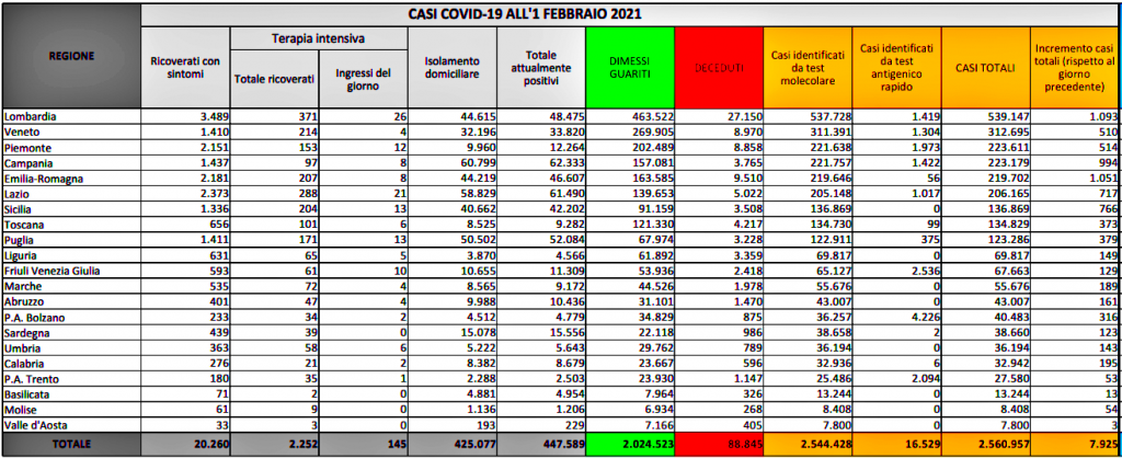 Le persone ricoverate in terapia intensiva in Italia sono 2.252, quindi 37 in più rispetto a ieri, nel saldo tra ingressi e uscite; gli ingressi giornalieri sono 145. I ricoverati con sintomi sono invece 20.260, quindi 164 in più di ieri. Il totale delle vittime da inizio pandemia è di 88.845. I guariti sono in totale 2.024.523 (+13.975 da ieri). Gli attualmente positivi, invece, 447.589. Il tasso di positività al virus è risultato oggi pari al 5,6% rispetto al 5,27% di ieri. Le regioni che comunicano il maggior numero di test positivi al coronavirus nelle 24 ore sono Lombardia 1.093, Emilia Romagna 1.051, Campania 994, secondo i dati del ministero della Salute. Otto regioni continuano a non comunicare il dettaglio dei test antigenici rapidi positivi. Si tratta di Sicilia, Liguria, Marche, Abruzzo, Umbria, Basilicata, Molise e Valle d’Aosta.
