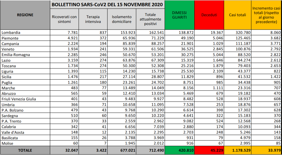 Sono 33.979 i nuovi contagi registrati in Italia nelle ultime 24 ore mentre sono 546 i decessi. Attualmente, sono 712.490 le persone positive