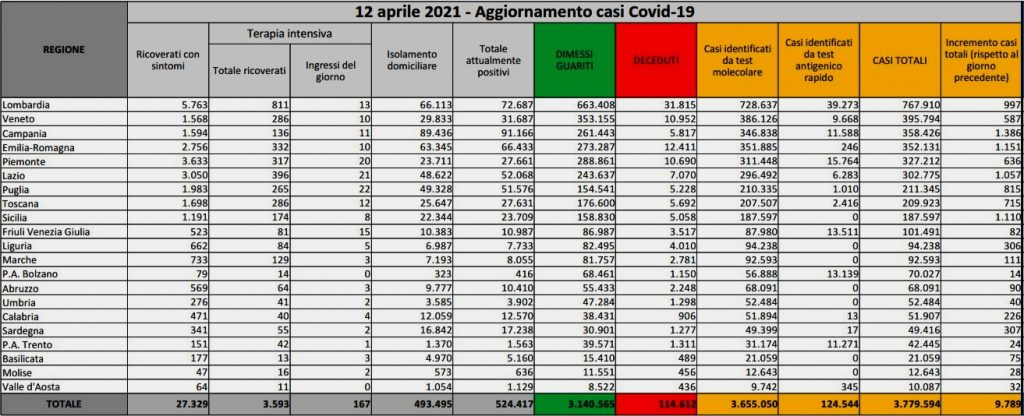 Sono 3.593 i pazienti ricoverati nelle terapie intensive per Covid in Italia, in aumento di 8 unità rispetto a ieri nel saldo giornaliero tra entrate e uscite, mentre gli ingressi giornalieri sono stati 167 (ieri 175). Nei reparti ordinari sono invece ricoverate 27.329 persone, in aumento di 78 rispetto a ieri. In totale i casi da inizio pandemia sono 3.779.594, i morti 114.612 . Gli attualmente positivi sono 524.417 (-8.588 rispetto a ieri), mentre i guariti e dimessi sono 3.140.565 (+18.010). In isolamento domiciliare ci sono 493.495 persone (-8.674 rispetto a ieri). La Regione con più casi odierni è la Campania (+1.386), seguita da Emilia Romagna (+1.151), Sicilia (+1.110), Lazio (+1.057) e Lombardia (+997).