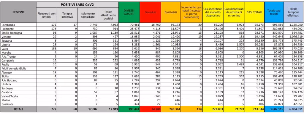 La Sicilia fa registrare 15 nuovi casi, invece in 8 regioni: Campania, Puglia, Abruzzo, Umbria, Calabria, Valle d’Aosta, Molise e Basilicata, più la provincia autonoma di Trento, non è stato registrato nessun contagio da ieri. Dei 12.919 casi di attuali positivi, 777 sono i ricoverati con sintomi, 60 (di cui 27 in Lombardia) quelli in terapia intensiva e 12.082 quelli in isolamento domiciliare. I casi di malati ricoverati in terapia intensiva complessivamente sono scesi di 5 unità rispetto a ieri e, oltre alla Lombardia, riguardano altre cinque Regioni: Lazio con 10, Piemonte ed Emilia Romagna con 9, Veneto e Toscana con 2. Delle 114 persone risultate positive al coronavirus, 30 sono in Lombardia, 19 in Veneto e 18 nel Lazio. Sono 777 i pazienti ricoverati con sintomi (+9). Sono 12.082 i pazienti in isolamento domiciliare (-242).