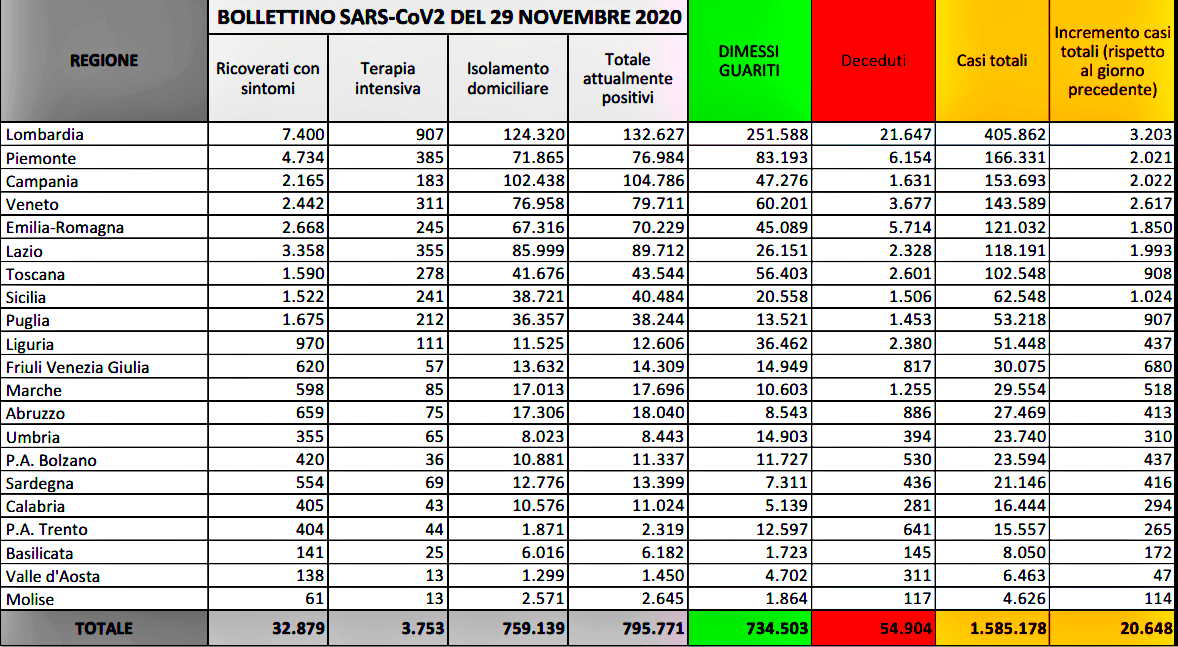 Sono 20.648 i nuovi positivi e 541 le vittime nelle ultime 24 ore