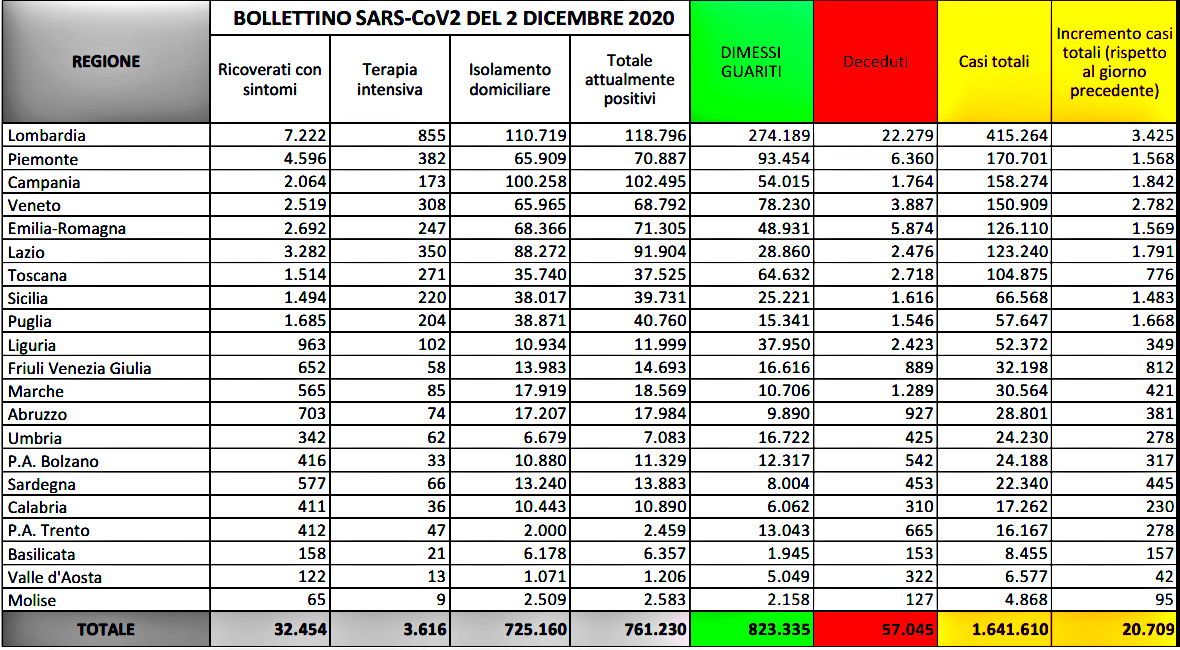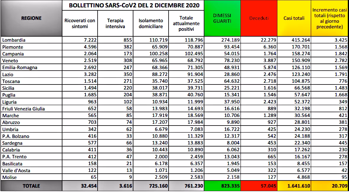 Sono 20.709 (19.350 ieri) i novi casi di Covid 19 registrati nella ultime 24 ore in Italia dove sono avvenuti 684 (785 ieri) decessi. Attualmente sono positive 761.230 persone. Nelle ultime 24 ore sono stati registrati 207.143 tamponi, 25043 più di ieri. E’ quanto emerge dall’odierno bollettino del ministero della Salute-Iss. Sono 32454, (-357 rispetto a ieri) le persone ricoverate con sintomi Covid-19 negli ospedali italiani, 3616 (- 47 rispetto a ieri) le persone ricoverate nelle terapie intensive. Mentro sono 725.160 (- 18311 rispetto a ieri) le persone in isolamento domiciliare. Sale a 82.3335 (-38740 rispetto a ieri) il numero dei guariti dimessi. Sale a 57.045 il numero complessivo dei deceduti dall’inizio della pandemia. Sul fronte tamponi, ne sono stati registrati 207.143. Sale così a 22.334.342 in numero complessivo dei tamponi effettuati da inizio pandemia nel nostro Paese. Ad oggi, grazie al sospetto diagnostico, sono stati individuati 988.470 positivi mentre le attività di screening hanno individuato 653.140 positivi. A livello territoriale, le regioni con il maggior numero di contagi sono la Lombardia (3.425), il Veneto (2.782), la Campania (1.842), il Lazio (1.791), la Puglia (1.668) e il Piemonte (1.568).