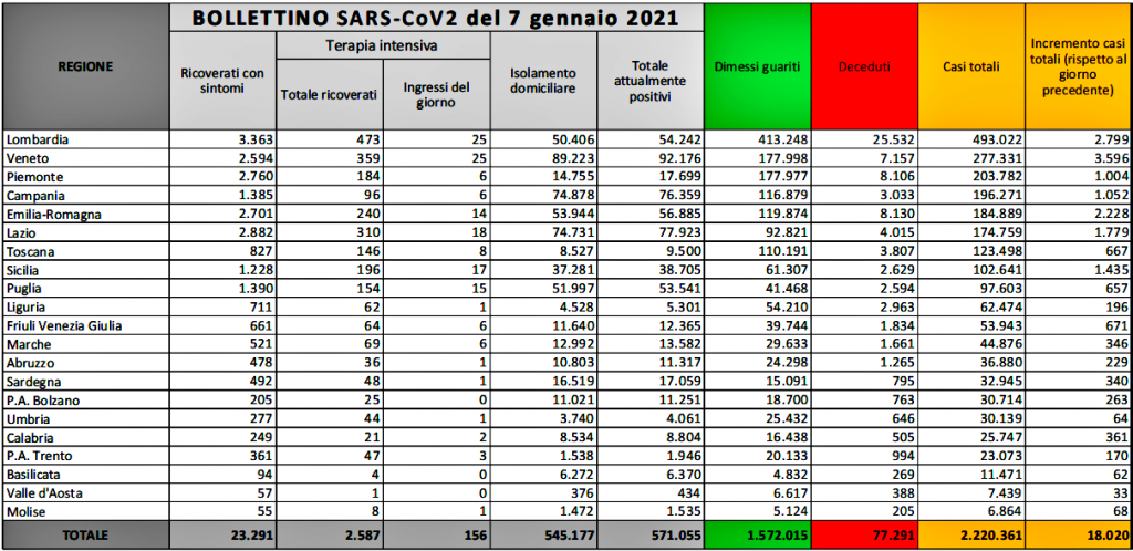 Sono 18.020 (ieri 20.331) i nuovi casi di Sars-Cov-2 registrati in Italia nelle ultime 24 ore e 414 (ieri 548) decessi. Un dato, quest’ultimo, che porta a 77.291 il numero dei morti nel nostro paese da inizio pandemia. E’ quanto emerge dall’odierno bollettino del ministero della Salute-Iss. Oggi in Italia sono attualmente positive 571.055 persone, 2343 più di ieri. Sono 23291, 117 più di ieri, invece, le persone ricoverate negli ospedali italiani con sintomi Covid-19. Nelle terapie intensive sono curate 2857 persone, 16 più di ieri. Nelle ultime 24 ore sono stati effettuati 121.275 tamponi, oltre 55mila meno di ieri quando erano stati 178.596. Il tasso di positività risale al 14,8%, tre punti e mezzo in più di mercoledì quando era all’11,3%.