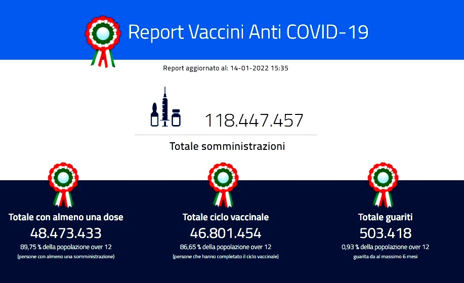 Dall’inizio della pandemia sono 8.356.514 le persone che hanno contratto il virus Sars-CoV-2, mentre da febbraio 2020 le vittime totali sono 140.548. Sono in tutto 5.817.138 i guariti o dimessi, mentre sono 125.199 le persone diventate negative nelle ultime 24 ore (ieri 82.803). Le persone che risultano attualmente positive sono in tutto 2.398.828, pari a +75.310 rispetto a ieri (+101.458 il giorno prima). Compresi quelli molecolari e gli antigenici, i tamponi totali processati sono stati 1.132.309, dunque 48.870 in meno rispetto a 1.181.179 di ieri. Il tasso di positività sale al 16,4%, ieri era al 15,6%. Sul fronte del sistema sanitario, crescono le degenze in ogni area. Sono infatti +371 (ieri +339), per un totale di 18.019 ricoverati, i posti letto occupati nei reparti Covid ordinari. Sono invece +11 (ieri -1) i posti letto occupati in terapia intensiva, numero che porta a 1.679 il totale dei malati più gravi, con 136 ingressi in rianimazione (ieri 156).