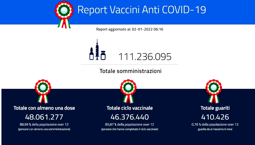 Secondo l’odierno bollettino del ministero della Salute sull’emergenza coronavirus, sono 61.046 nuovi casi in Italia nelle ultime 24 ore su 278.654 tamponi eseguiti. L’incidenza di casi positivi è pertanto del 21,9% come detto. Le vittime del virus nelle ultime 24 ore sono state 133, mentre attualmente in Italia le persone positive al Covid-19 sono 1.070.537. Di queste 11.756 sono ricoverate in ospedale, 1.319 dei quali in terapia intensiva. Le terapie intensive nelle ultime 24 ore hanno registrato 104 ingressi. Il numero totale dei casi da inizio pandemia è pari a 6.328.076. I dimessi/guariti crescono di 12.164 unità, arrivando a 5.119.893, mentre gli attualmente positivi diventano 1.070.537 di cui 1.057.462 in isolamento domiciliare. La regione con il maggior numero di nuovi casi si conferma la Lombardia con 10.425 davanti a Emilia Romagna (9.090), Lazio (7.993), Toscana (6.397) e Campania (5.192).