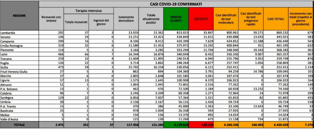Salgono ancora anche i ricoveri: le terapie intensive sono 15 in più (come ieri) con 37 ingressi del giorno, di cui 7 nel Lazio e 6 in Veneto ed Emilia Romagna, e arrivano a 352 totali, mentre i ricoveri ordinari sono 27 in più (ieri +68), 2.975 in tutto. Nelle ultime 24 ore sono stati eseguiti 216.969 tamponi, il tasso positività sale al 3,3% rispetto al 3% di ieri.La regione con più casi odierni è ancora la Sicilia, in forte aumento con 1.134 casi, l’unica sopra quota mille, seguita da Toscana (+876), Lombardia (+679), Emilia Romagna (+632) e Veneto (+583).