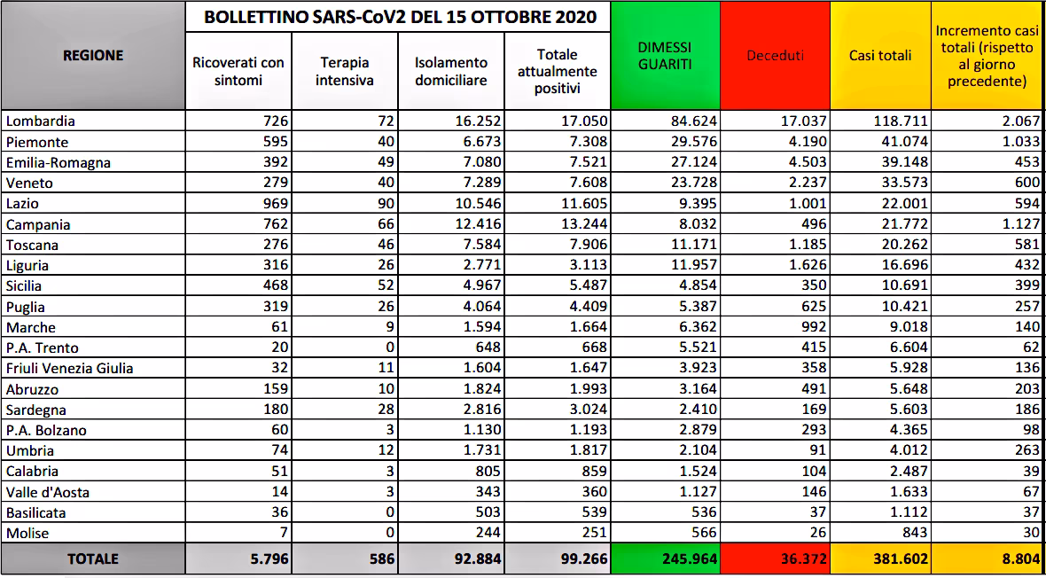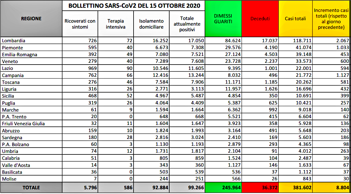 Prende forza il coronavirus in Italia. L’odierno bollettino del ministero della Salute, infatti, riporta 8.804 nuovi casi nelle ultime 24 ore, +6.821 attualmente positivi, +1.899 guariti e 83 morti. Un bilancio pesante che registra 162.932 nuovi tamponi effettuati. Ieri i nuovi casi totali erano stati 7.332, con 43 morti, +2.037 guariti, +5.252 attuali positivi. Le terapie intensive aumentano di 47 (totale 586) e i ricoverati con sintomi di 326 (totale 5796). La Regione col maggior numero di contagiati torna ad essere la Lombardia dove sono 2.067 i nuovi positivi, il 6,3% circa dei 32.507 tamponi processati in 24 ore, il massimo numero raggiunto da inizio pandemia. Seguono la Campania, +1.127, il Piemonte +1.033, il Veneto, +600 e il Lazio, +594.