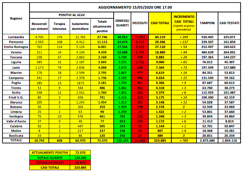 Nel dettaglio, i casi attualmente positivi sono 27.746 in Lombardia, 11.113 in Piemonte, 6.001 in Emilia-Romagna, 4.439 in Veneto, 3.168 in Toscana, 2.603 in Liguria, 4.088 nel Lazio, 2.795 nelle Marche, 1.736 in Campania, 2.181 in Puglia, 406 nella Provincia autonoma di Trento, 1.760 in Sicilia, 741 in Friuli Venezia Giulia, 1.454 in Abruzzo, 359 nella Provincia autonoma di Bolzano, 90 in Umbria, 461 in Sardegna, 77 in Valle d’Aosta, 505 in Calabria, 227 in Molise e 120 in Basilicata.