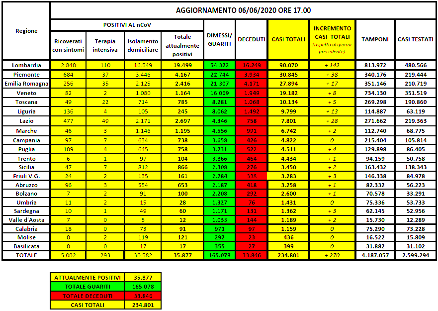 Molti tamponi e basso livello di nuovi positivi al coronavirus. Praticamente al minimo dall’inizio dell’epidemia. I nuovi dati sull’epidemia da coronavirus diffusi dalla Protezione Civile fanno ben sperare. Sono trascorsi tre mesi esatti da quando l’Italia ha cominciato a monitorare la curva epidemica perché si scopriva contagiata dall’epidemia da Coronavirus. Fino ad allora si era avuta notizia dei focolai nella regione dell’Hubei, in Cina, e nelle regioni confinanti. Oggi l’Italia conta 33.846 vittime in totale legate al Covid-19 (ieri il dato era arrivato a quota 33.774). Stando all’ultimo bollettino giornaliero diffuso dalla Protezione Civile, nelle ultime 24 ore si sono registrati +72 nuovi morti (ieri l’aumento dei decessi era di +85, e il giorno prima di +88). L’incremento dei decessi dell’ultimo giorno è dunque in lieve calo, ma sostanzialmente in linea con quello dei giorni scorsi.