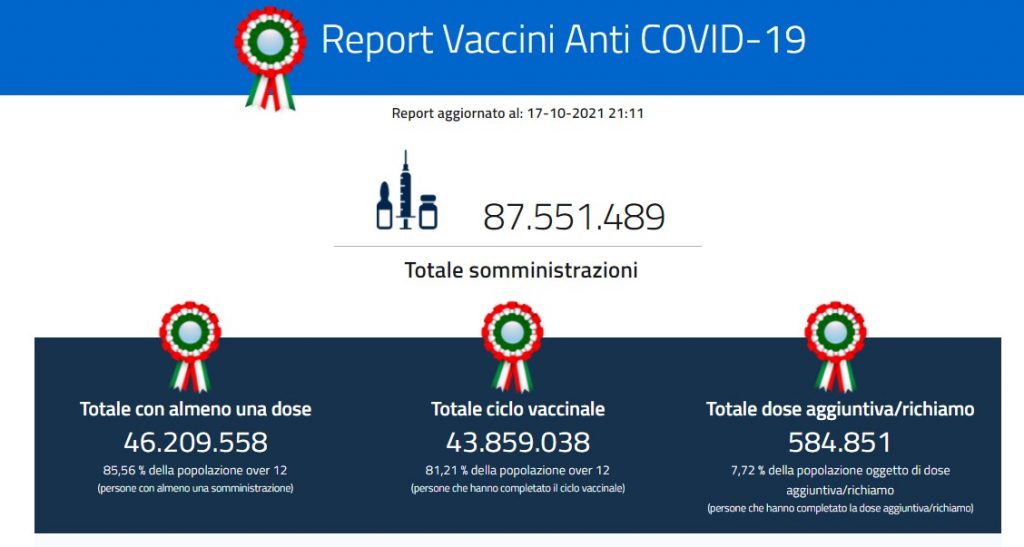 Calano i nuovi casi di Covid in Italia, aumentano leggermente i ricoveri che da giorni registravano un segno meno. Una piccola risalita invece si registra sui morti rispetto a ieri. Intanto, con l’accelerazione degli ultimi giorni, i Green pass scaricati hanno superato quota 100 milioni, 100.595.790 nello specifico. Lo ‘sprint’ si è dunque registrato a cavallo dall’entrata in vigore dell’obbligo della certificazione per i lavoratori: tra il 14 ed il 16 ottobre sono stati infatti scaricati ben 2,5 milioni con il record toccato proprio venerdì (867.039). Di questi ultimi la grande maggioranza (1,8 milioni) sono a seguito di tamponi; seguono quelli derivanti da vaccinazione (643.184) e, infine, con una quota residuale, le certificazioni derivanti da guarigione (10.880).