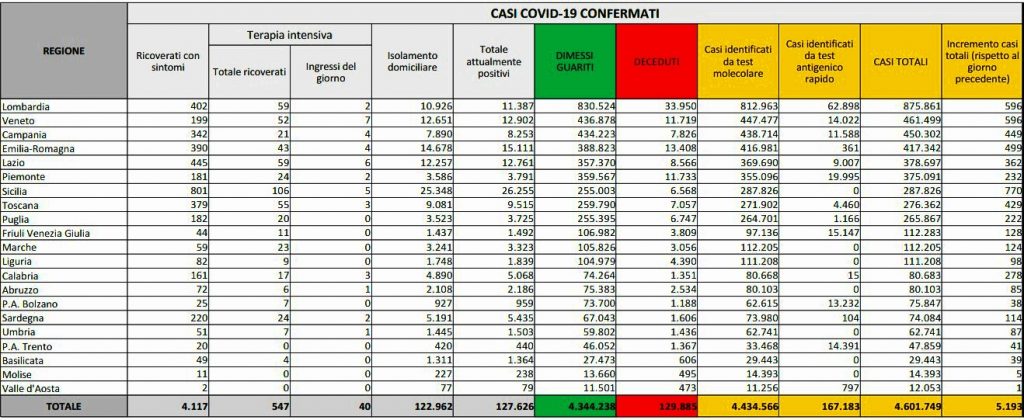 Prosegue il trend in discesa dei contagi. Sono 5.193 (ieri 5.621) i nuovi casi di Covid-19 riscontrati nelle ultime 24 ore in Italia e 57 (ieri 62) i decessi. È quanto emerge dall’odierno bollettino del ministero della Salute. Il totale dei contagiati dall’inizio della pandemia è di 4.601.749. Le vittime, invece, sono 57 contro le 62 di ieri e le 59 del giorno prima. I deceduti, dall’inizio della pandemia, sono in tutto 129.885. Le persone attualmente positive sono 127.626 (ieri 128.489).