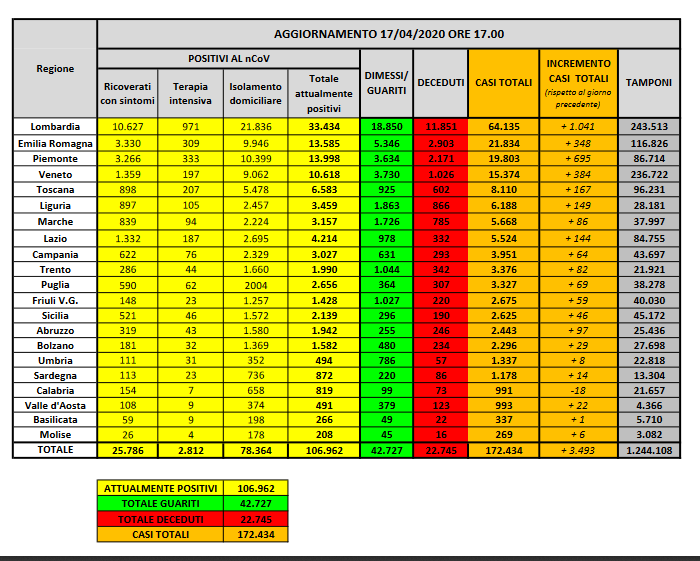 In cifre, dal bollettino di oggi 17 aprile emerge che i casi di positività al coronavirus sono ad oggi 106.962: 355 in più rispetto a ieri. Il numero totale dei casi, che include anche le vittime e i guariti, da inizio pandemia si attesta a quota 172.434 (3.493 in più rispetto a ieri). I pazienti di covid-19 in terapia intensiva sono ad oggi 2.812, 124 in meno rispetto a ieri. Dei 106.962 attualmente positivi, ha precisato il capo della Protezione civile, Angelo Borrelli, 25.786 sono ricoverati con sintomi, 2.812 in terapia intensiva e 78.364 in isolamento domiciliare. E ancora. Sono 575 le vittime di covid-19 registrate nelle ultime 24 ore che portano a un totale di decessi a 22.745. Da ieri si contano 2.563 nuovi guariti. Il numero totale sale così a 42.727. “E’ il numero più alto in assoluto da inizio emergenza”, ha detto Borrelli. Quasi 65.705 i tamponi effettuati. Il capo della Protezione Civile ha anche annunciato una “svolta”. Da lunedì, infatti, non ci sarà più il bollettino quotidiano ma solo due aggiornamenti a settimana: il lunedì e il giovedì.