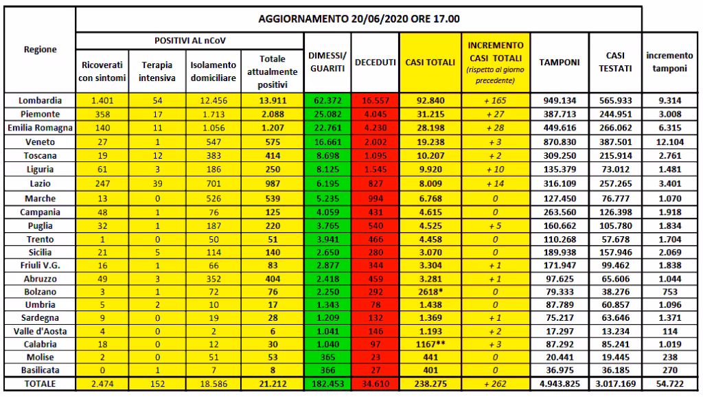 Continua a restare stabile la curva epidemica in Italia. Dall’odierno bollettino della Protezione civile emergono 262 nuovi casi, contro i 251 di ieri (165 solo in Lombardia), per un totale di 238.275 persone colpite da Covid-19 dall’inizio dell’emergenza. Rimangono sotto quota 50 i decessi, 49 oggi contro i 47 di ieri, per un totale di 34.610. Netto calo dei guariti invece, 546 oggi contro i 1.363 di ieri: in tutto sono 182.453. Per effetto di questi dati, diminuisce meno del solito il numero degli attualmente positivi, 331 in meno oggi contro i 1.558 di ieri, per un totale di 21.212. Tra gli attualmente positivi, 152 sono in cura presso le terapie intensive, con un decremento di 9 pazienti rispetto a ieri. 2.474 persone sono ricoverate con sintomi, con un decremento di 158 pazienti rispetto a ieri. Mentre 18.586 persone, pari all`88% degli attualmente positivi, sono in isolamento senza sintomi o con sintomi lievi.