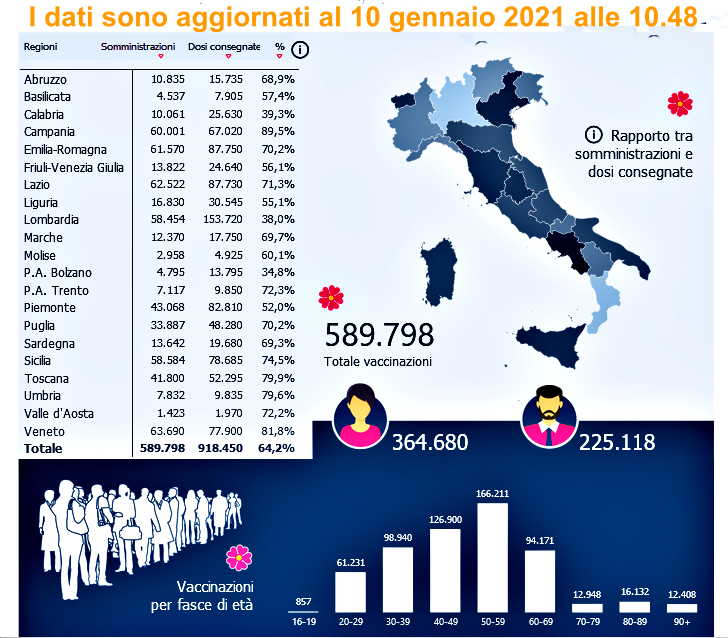 Intanto, entro la fine di marzo saranno vaccinati 6 milioni di italiani. Lo ha confermato il Commissario per l’emergenza Domenico Arcuri, sottolineando che i contratti aggiuntivi sottoscritti dall’Ue con Pfizer e Moderna consentiranno «di raggiungere quel numero di vaccinati”. Nel corso dell’anno, ha aggiunto Arcuri, “l’Italia otterrà 60 milioni di dosi da questi due produttori e potremo vaccinare 30 milioni di italiani”.
