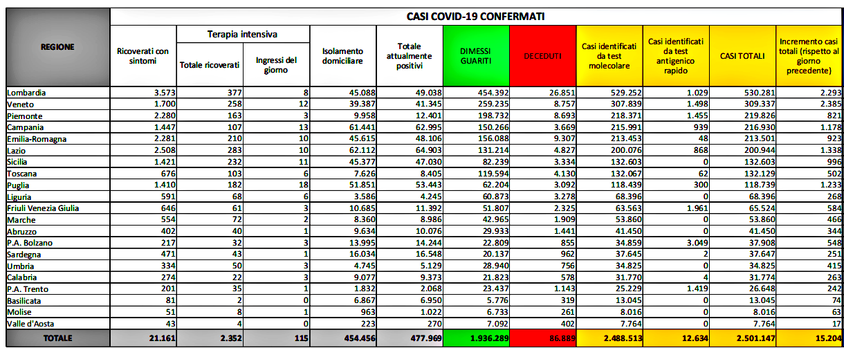 Sono 15.204 i nuovi casi di Covid-19 individuati nelle ultime 24 ore 467 i morti. È quanto emerge dall’odierno bollettino del ministero della Salute sull’emergenza coronavirus. Ieri i nuovi casi erano stati 10.593 e i morti 541. Sono 293.770 i test eseguiti nelle ultime 24 ore (molecolari e antigenici) secondo i dati del ministero della Salute. Ieri erano stati 257.034. Il tasso di positività è del 5,17% (ieri era del 4,1%, quindi in aumento di oltre l’1%). I casi totali da inizio epidemia sono ora 2.501.147, i morti 86.889. Gli attualmente positivi sono 477.969, con un calo di 4.448 rispetto a ieri. Sono invece 1.936.289 i pazienti dimessi o guariti, con un incremento nelle ultime 24 ore di 19.172 unità. In isolamento domiciliare ci sono 454.456 persone (-4.234 rispetto a ieri). I ricoveri in terapia intensiva per il Covid-19 sono in calo di 20 unità nel saldo tra entrate e uscite rispetto al giorno precedente, secondo i dati del ministero della Salute. Gli ingressi giornalieri sono 115. In totale in rianimazione ci sono 2.352 persone. Nei reparti ordinari sono invece ricoverati 21.161 pazienti, in calo di 194 unità rispetto a ieri.