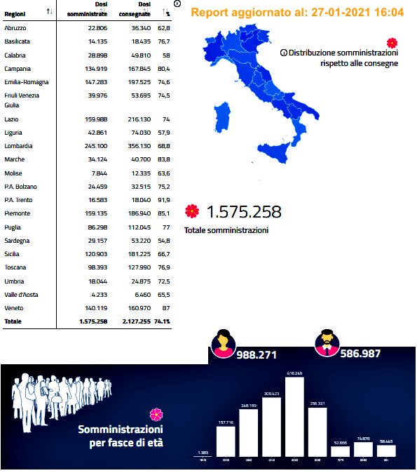 Oggi in Friuli Venezia Giulia su 6.719 tamponi molecolari sono stati rilevati 360 nuovi contagi con una percentuale di positività del 5,36%. Sono inoltre 4.349 i test rapidi antigenici realizzati, dai quali sono stati rilevati 224 casi (5,15%). I decessi registrati sono 25 ai quali si aggiunge uno avvenuto il 27 dicembre 2020. I ricoveri nelle terapie intensive scendono a 61 (ieri erano 64) e quelli in altri reparti a 646 (ieri 668). Lo comunica il vicegovernatore del Fvg con delega alla Salute, Riccardo Riccardi. I decessi complessivamente ammontano a 2.325, con la seguente suddivisione territoriale: 536 a Trieste, 1.112 a Udine, 524 a Pordenone e 153 a Gorizia. I totalmente guariti sono 50.287, i clinicamente guariti salgono a 1.520, mentre scendono le persone in isolamento che oggi risultano essere 10.685. Dall’inizio della pandemia in Friuli Venezia Giulia sono risultate positive complessivamente 65.524 persone con la seguente suddivisione territoriale: 13.212 a Trieste, 28.790 a Udine, 14.801 a Pordenone, 7.920 a Gorizia e 801 da fuori regione.