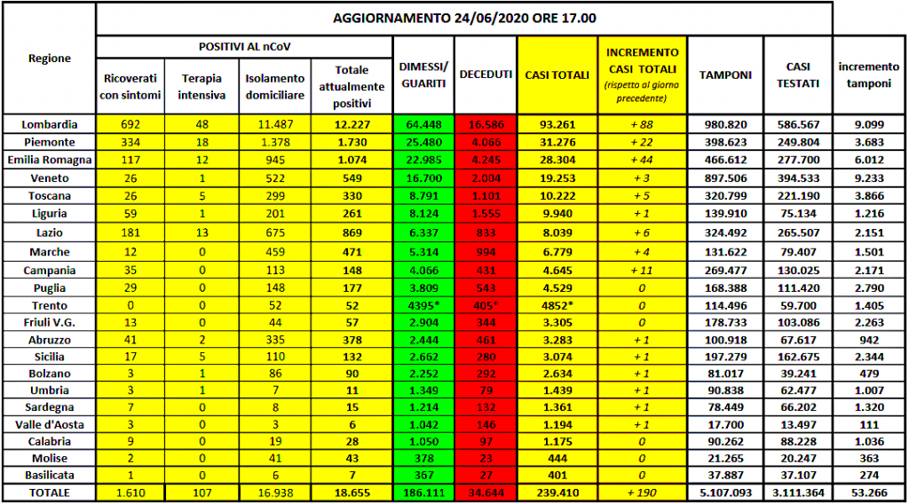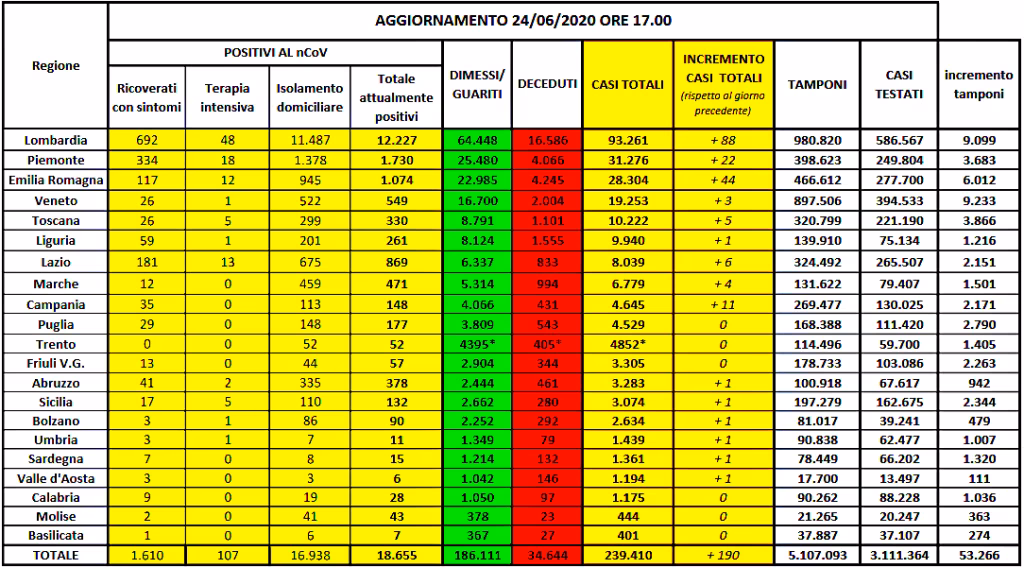 Risalngono i contagi. L’incremento giornaliero è di 190 nuovi positivi (in aumento rispetto a ieri, quando era stato di 122) sebbene cinque regioni registrino un aumento zero (Puglia, Friuli Venezia Giulia, Calabria, Molise e Basilicata, oltre alla provincia autonoma di Trento che comunica però un ricalcolo di 387 casi in più). E’ quanto emerge dall’odierno bollettino della Protezione civile sull’emergenza coronavirus che evidenzia il totale delle persone che hanno contratto il virus pari a 239.410. Nelle ultime 24 ore registrati anche 30 morti, che portano il totale a di 34.644 (anche in questo caso la provincia autonoma di Trento ha ricalcolato il numero, diminuendo il totale di 61 unità).