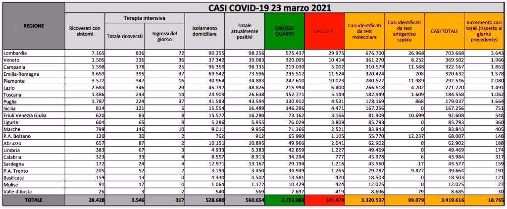 Tornando alle cifre, i casi totali da inizio epidemia sono 3.440.862, i morti salgono invece a 106.339. Ci sono 561.308 attualmente positivi, in aumento di 654 rispetto a ieri. Dall’inizio della pandemia sono invece 2.773.215 i guariti e i dimessi, con un incremento nelle ultime 24 ore di 20.132. Sul fronte ricoveri, sono 3.588 i pazienti in terapia intensiva, 42 più di ieri nel saldo giornaliero tra entrate e uscite, mentre gli ingressi giornalieri in rianimazione sono 300, ieri erano stati 317. Nei reparti ordinari sono invece ricoverate 28.438 persone, con un incremento di appena 10 unità nelle ultime 24 ore. Infine, la regione con più casi giornalieri resta la Lombardia (+4.282), seguita da Piemonte (+2.223), Campania (+2.045), Veneto (+2.042) ed Emilia Romagna (+1.725).
