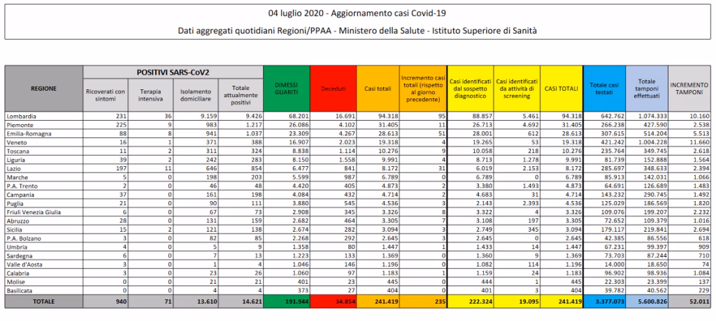 I decessi nelle ultime 24 ore sono stati 21, contro i 15 di ieri, con il totale delle vittime che sale a 34.854. Oggi 235 nuovi casi, contro i 223 di ieri (il 29 giugno erano 126)