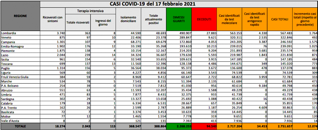 Ancora in discesa i ricoveri: in terapia intensiva si registrano 31 pazienti in meno (ieri -15) con 113 ingressi del giorno, per un totale di 2.043, mentre i ricoveri ordinari sono 189 in meno (ieri -52), e scendono a 18.274. Gli attualmente positivi sono 388.864. Di questi, 368.547 si trovano in isolamento domiciliare, 18.274 sono ricoverati con sintomi mentre sono 16.519 i guariti. Ad avere oltre mille nuovi contagiati sono Lombardia (+1.764) con 38 mila tamponi, Campania (+1.575), ed Emilia-Romagna (1.025). Tutte le altre regioni mostrano un incremento a due o tre cifre. Da notare il Veneto: con 39 mila test processati (il numero regionale più alto di tamponi della giornata) ha trovato 492 positivi. «Abbiamo un’incidenza di 1,26%, bassissima rispetto alla media nazionale del 4%», precisa il governatore Luca Zaia. Purtroppo il Veneto registra oggi anche il maggior numero di morti in 24 ore (+70 decessi), si tratta per lo più di persone che si sono ammalate tre o quatto settimane fa.