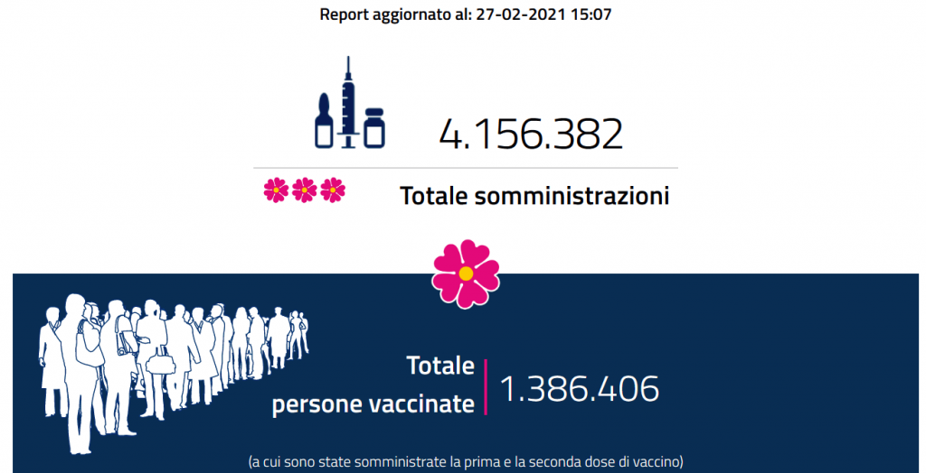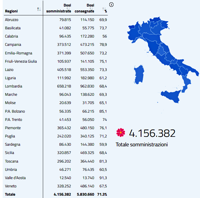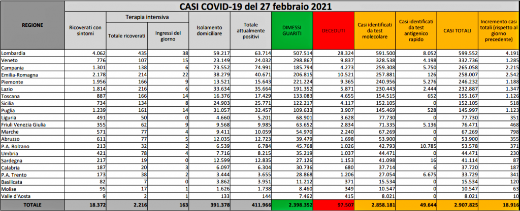 Gli attualmente positivi sono 411.966 mentre 11.320 sono i pazienti dimessi o guariti da ieri, per un totale di 2.398.352 pazienti dall’inizio della pandemia. Sono 102 i pazienti ricoverati nelle ultime 24 ore per un totale di 20.588. I pazienti che sono stati ricoverati in terapia intensiva crescono di 22 unità nelle ultime 24 ore, per un totale di 2.216. La Regione che fa registrare il più alto numero di infezioni su base giornaliera è la Lombardia, seguita dall’Emilia Romagna. Le dosi di vaccino anti-Covid somministrate finora sono state 4.156.382, mentre a ricevere entrambe le dosi ed essere quindi completamente vaccinati sono state 1.386.406 persone.