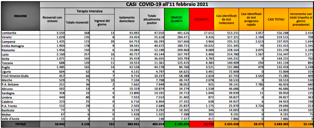 Le persone attualmente ricoverate in terapia intensiva in Italia a causa del Covid sono 2.126, due in meno rispetto a ieri. I ricoverati con sintomi sono invece 18.942 (-338 rispetto a ieri). Le vittime totali del coronavirus a oggi in Italia sono 92.729. Per il secondo giorno consecutivo La Valle d’Aosta non registra decessi per coronavirus. La Lombardia, con 2.434 nuovi casi è la regione dove si registra il maggior numero di contagi, seguita da Campania (1.694) ed Emilia Romagna (1.345).