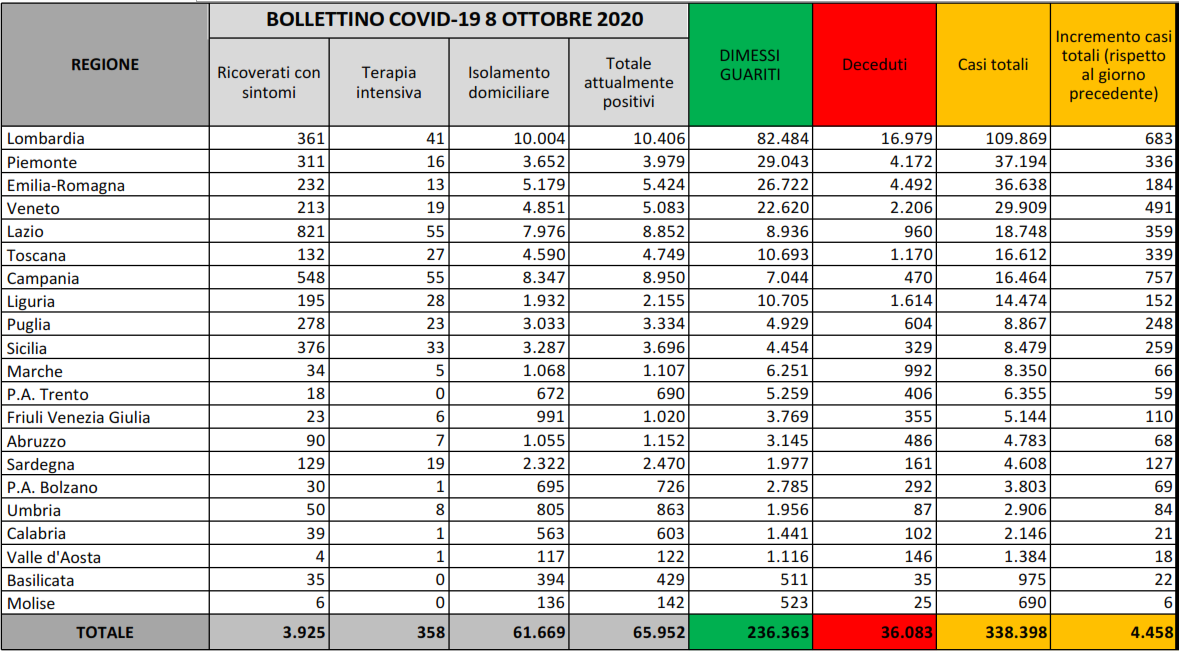 In ben dodici regioni si registrano più di 100 nuovi casi: 757 in Campania, 683 in Lombardia, 491 in Veneto, 359 nel Lazio, 339 in Toscana, 336 in Piemonte, 259 in Sicilia, 248 in Puglia, 184 in Emilia Romagna, 152 in Liguria, 127 in Sardegna e 110 in Friuli Venezia Giulia. Le 22 vittime sono distribuite tra Veneto (6), Lazio (6), Sicilia (3), Lombardia (1), Emilia Romagna (1), Campania (1), Puglia (1), Abruzzo (1), Sardegna (1) e Umbria (1). In crescita anche la pressione sulle strutture ospedaliere: i ricoverati con sintomi sono 3.925 (143 in più di ieri) e quelli in terapia intensiva.