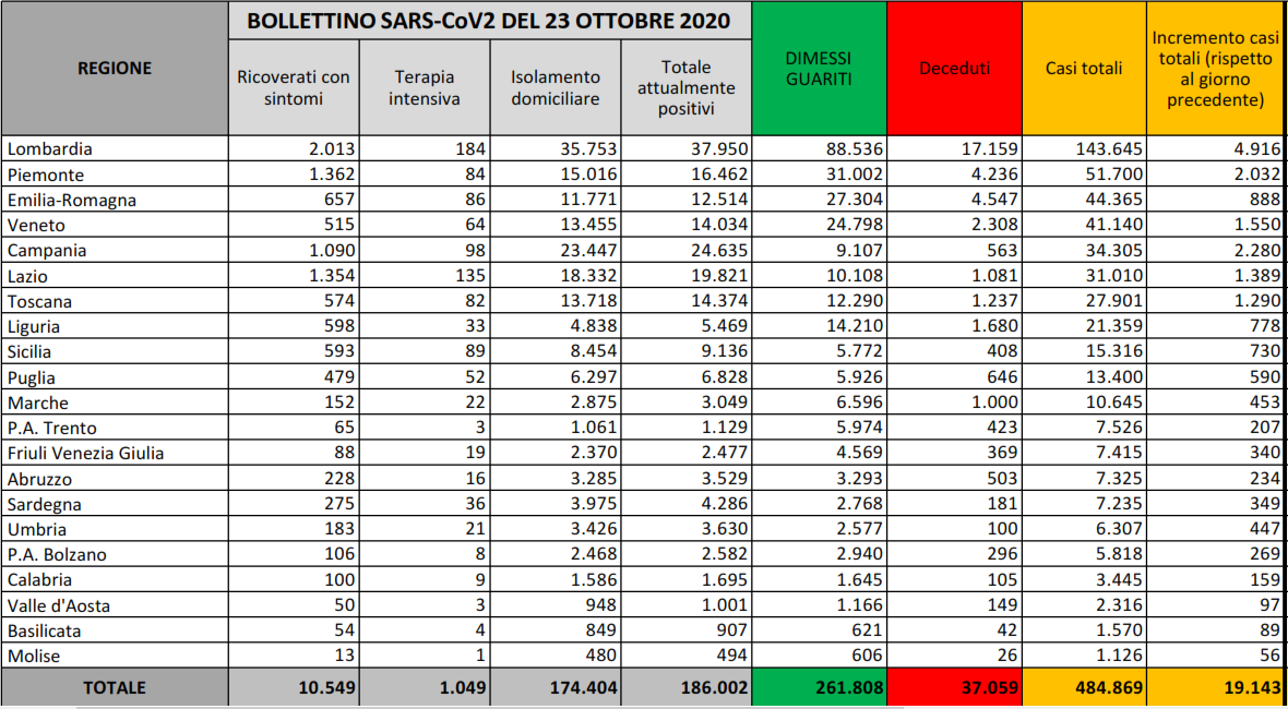 Sono 19.143 (ieri 16.079) i nuovi contagi da Sars-Cov-2 in Italia, che portano il totale a 484.869, e 91 (ieri 136) i morti da Covid-19 nelle ultime 24 ore, che portano il totale dei deceduti dall’inizio della pandemia a 37.059. E’ quanto emerge dall’odierno bollettino del ministero della Salute e dell’Istituo Superiore di Sanità. Dunque, continua ad aumentare l’incremento dei nuovi casi giornalieri (+3.064 rispetto a ieri) – ma oggi si registra anche un notevole aumento di tamponi per la ricerca del Sars-Cov-2: nelle ultime 24 ore sono stati fatti 182.032 tamponi, +11.640 rispetto a ieri.