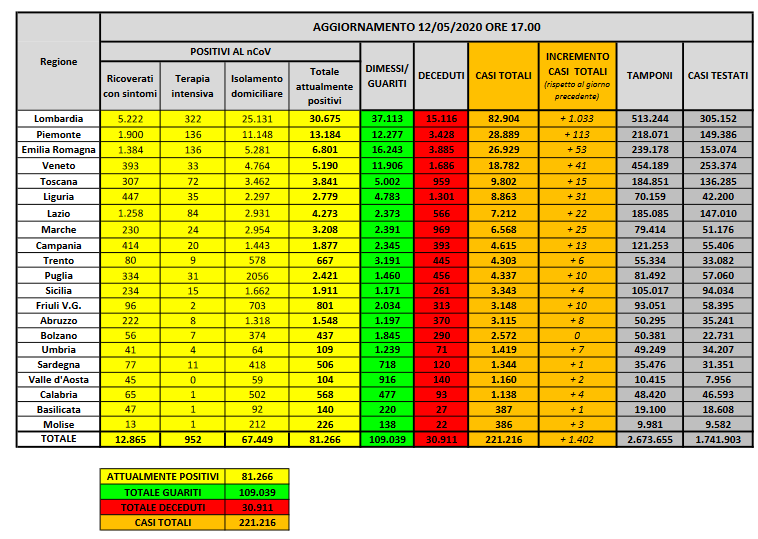 Nel dettaglio, i casi attualmente positivi sono 30.675 in Lombardia, 13.184 in Piemonte, 6.801 in Emilia-Romagna, 5.190 in Veneto, 3.841 in Toscana, 2.779 in Liguria, 4.273 nel Lazio, 3.208 nelle Marche, 1.877 in Campania, 667 nella Provincia autonoma di Trento, 2.421 in Puglia, 1.911 in Sicilia, 801 in Friuli Venezia Giulia, 1.548 in Abruzzo, 437 nella Provincia autonoma di Bolzano, 109 in Umbria, 506 in Sardegna, 104 in Valle d’Aosta, 568 in Calabria, 140 in Basilicata e 226 in Molise.