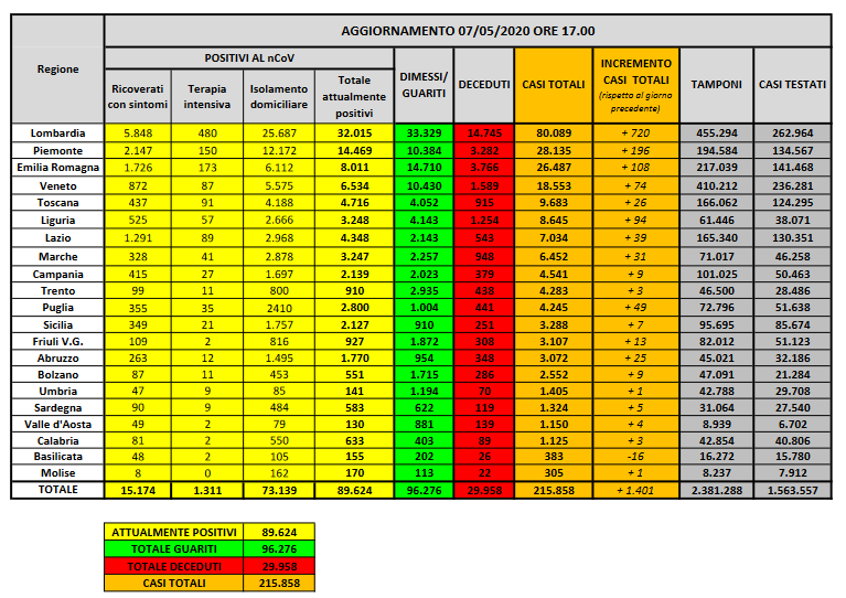 Gli attualmente positivi sono 32.015 in Lombardia (+262), 14.469 in Piemonte (-389), 8.011 in Emilia-Romagna (-380), 6.534 in Veneto (-255), 4.716 in Toscana (-372), 3.248 in Liguria (-58), 4.348 nel Lazio (-85), 3.247 nelle Marche (+11), 2.139 in Campania (-201), 910 nella Provincia autonoma di Trento (-72), 2.800 in Puglia (-103), 2.127 in Sicilia (-74), 927 in Friuli Venezia Giulia (-35),1.770 in Abruzzo (-21), 551 nella Provincia autonoma di Bolzano (-28), 141 in Umbria (-30), 583 in Sardegna (-40), 130 in Valle d’Aosta (+3), 633 in Calabria (-11), 155 in Basilicata (-17), 170 in Molise (-9).