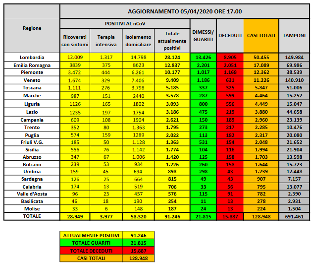 Arrivano buone notizie dalla Protezione civile che puntualmente alle 18 fa il punto sull’andamento dell’epidemia in Italia . “Oggi abbiamo due dati positivi: diminuiscono i ricoverati nei reparti ordinari e quelli nelle terapie intensive” ha detto il capo della Protezione civile Angelo Borrelli. Il numero totale dei pazienti positivi (cioè dei malati di coronavirus) è di 91.246 con un incremento di 2.972 su ieri; ieri l’incremento era stato di 2.886. Di questi 3977 sono in terapia intensiva con una diminuzione di 17 pazienti su ieri e 28.949 ricoverati con sintomi. Meno 61 su ieri. I deceduti nelle ultime 24 ore sono 525, dall’inizio dell’emergenza le vittime sono 15.887. I guariti in totale in Italia sono 21.815, più 819 rispetto a sabato 4 aprile.