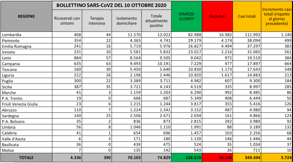 E’ di 5.724 (ieri erano stati 5.372) il numero di nuovi contagi da Covid-19 alla luce di oltre 133mila ((ieri 129.471)) tamponi effettuati e 29 (ieri 28) quello dei decessi, riscontrati nelle ultime 24 ore in Italia. E’ quanto emerge dall’odierno bollettino del ministero della Salute. Gli attualmente positivi sono in totale 74.829: 70.103 (+4.466) si trovano in isolamento domiciliare, 4336 sono ricoverati con sintomi e 390 (+3 rispetto ieri) sono in terapia intensiva. La Lombardia registra 1.140 nuovi positivi, la Campania 664. Infine i dimessi e guariti sono 238.525, aumentando di 976 unità.
