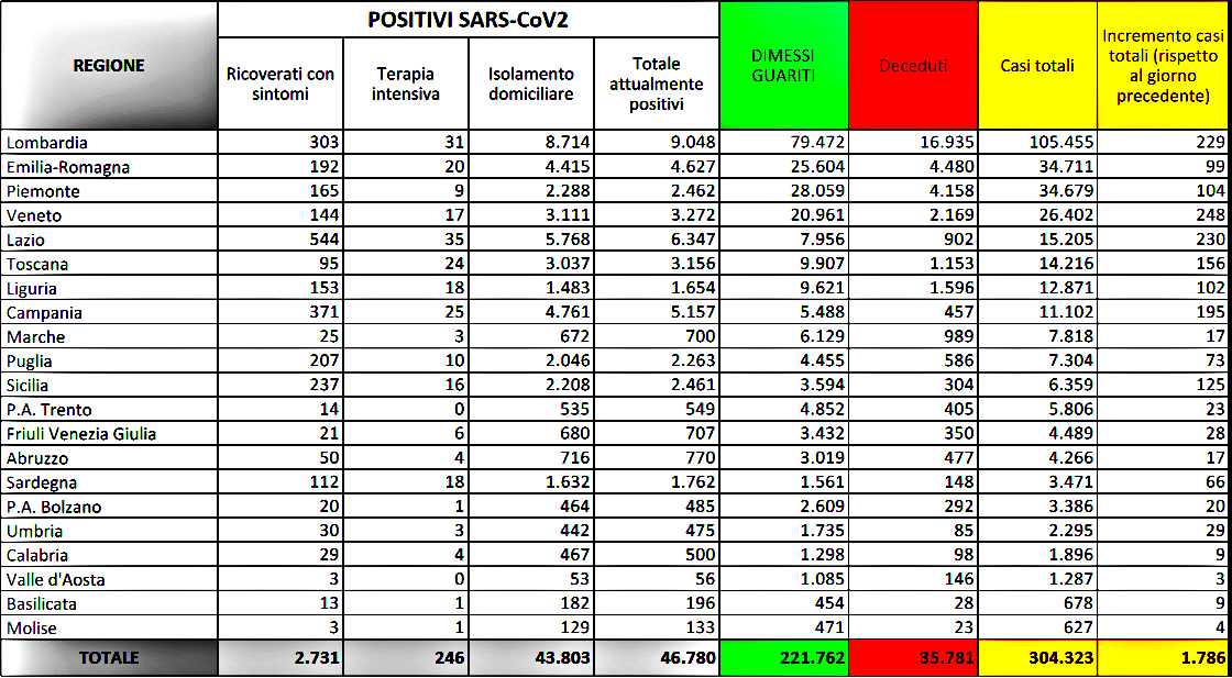 Sono 1786 nuovi casi di positività al Covid-19 registrati nelle ultime 24 ore in Italia dove sono avvenuti anche 23 decessi (finora 35.781). Attualmente sono positive 46.780 persone con un incremento di 666 rispetto a ieri. Sale invece a 221.762 il numero dei guariti con un incremento di 1097 rispetto a ieri. E’ quanto emerge dall’odierno bollettino del ministero della Salute Iss. Anche oggi nessuna regione italiana è rimasta immune a nuovi casi di positività al Covid-19. Il maggior numero di casi, fra i 1786 nuovi, è stato riscontrato in Veneto, con 248. Nel lazio 230 e in Lombardia 229. In Campania i nuovi positivi sono stati 195, 156 in Toscana, 125 in Sicilia, 104 in Piemonte e 102 in Liguria. La regione con meno contagi, 3, la Valle d’Aosta.