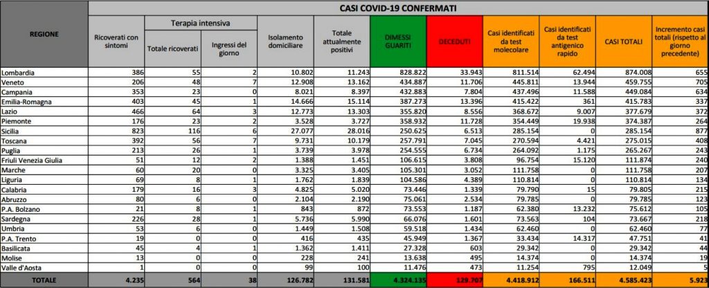 Stabile la tendenza dei contagi da Coronavirus nel bollettino odierno del ministero della Salute. Stazionario il numero di decessi, mentre Sardegna e Calabria, in bilico negli scorsi giorni, non dovrebbero passare in zona gialla, dove invece rimane per un’altra settimana la Sicilia. In cifre, sono 5.923 i nuovi casi di Covid-19 registrati nelle ultime 24 ore: 69 i morti e 8.058 i guariti.